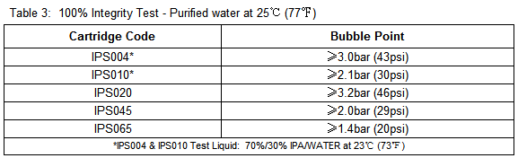 - Table 3: 100% Integrity Test – Purified water at 25 °C (77 °F)
