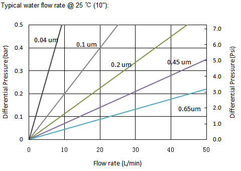 - Typical water flow rate @ 25 °C (10″):